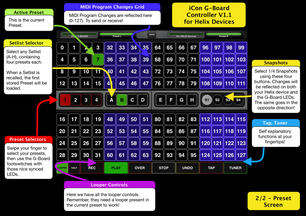 Provides all the logic to sync the eight onboard LEDs on the iCon G-Board with your iPad and your Helix device. 3-Way MIDI made easy!